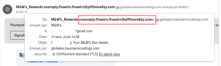 Ici, on constate que l'adresse mail de l'expéditeur regorge d'erreurs et qu'elle est farfelue. De plus le nom de domaine "@pl90aive8zy.com" ne correspond pas à celui de M&M's qui serait du genre @mms.com